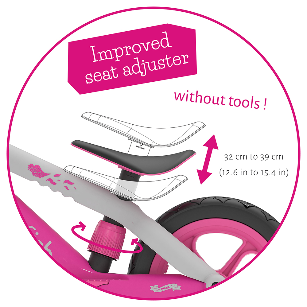 Sedište BMXie2 se podešava bez alata od 12,6-16,1 inča / 32-41 cm. Da li je vaše sedište previsoko ili prenisko? Samo okrenite, povucite i zaključajte - jednostavno je!
