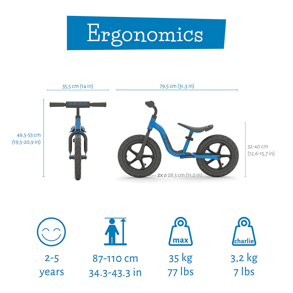 Čilafiš Čarli Sport je hiperlagan trenažer za ravnotežu od 12 inča sa gumama otpornim na probušenje i visokokvalitetnim metalnim ramom težine samo 3 kg. Savršena igračka za treniranje motoričkih sposobnosti, ravnoteže i upravljanja vašeg mališana! Zahvaljujući laganom ramu, vaše dete može lako da kontroliše bicikl, a u kombinaciji sa integrisanom ručkom za nošenje na sedištu, olakšava nošenje i roditeljima. Čarli Sport dolazi sa integrisanim osloncem za stopala i penom za upravljač za pravi trkački izgled. Gume RubberSkin od 12 inča bez probušenja su zaista udobne - više nema potrebe za naduvavanjem guma jer nema rizika od probušenja. Od sada postoji samo zabava!