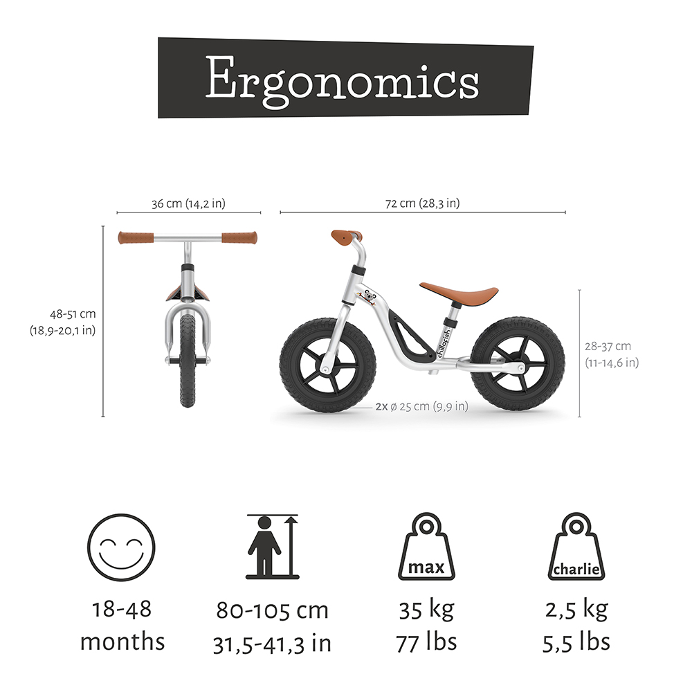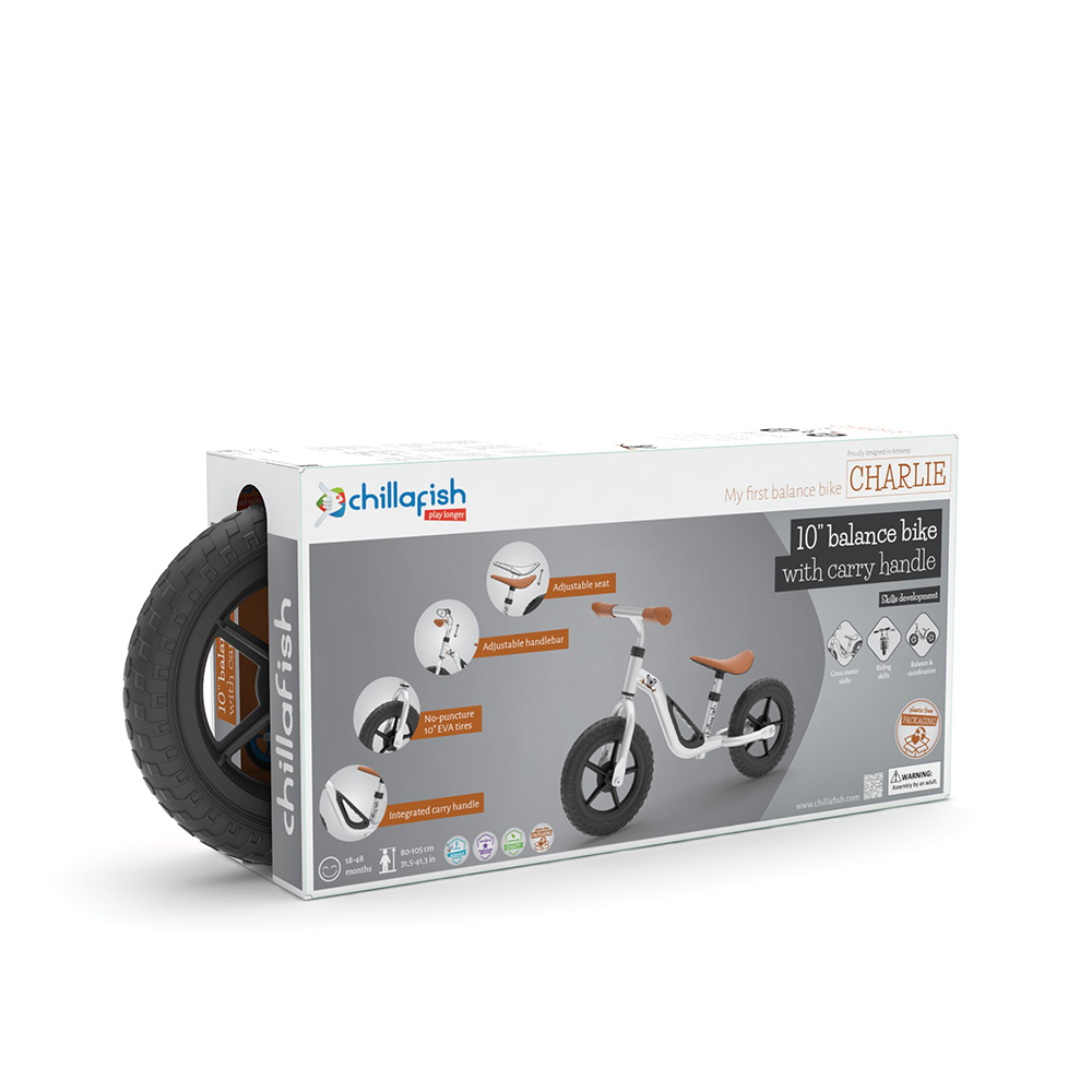 Chillafish Charlie je lagan i stilizovan balans bicikl sa 10‑inčnim točkovima koji je savršen izbor za najmlađe vozače koji tek uče ravnotežu, upravljanje i koordinaciju pre prelaska na pravi bicikl bez trening točkova.