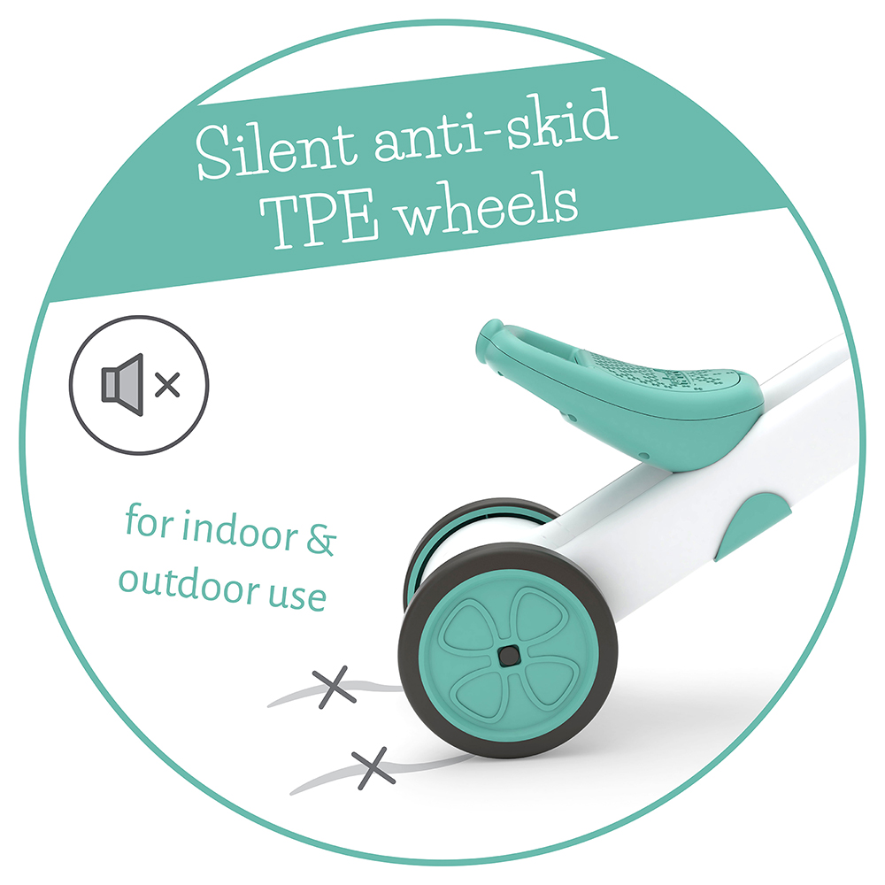 Prilagodljivo sedište raste zajedno sa detetom: 22 cm u tricikl modu i 26 cm u balans modu. Tihe, antisklizne i neostavljajuće tragove gume omogućavaju vožnju i u zatvorenom, dok su dovoljno izdržljive za igru napolju.