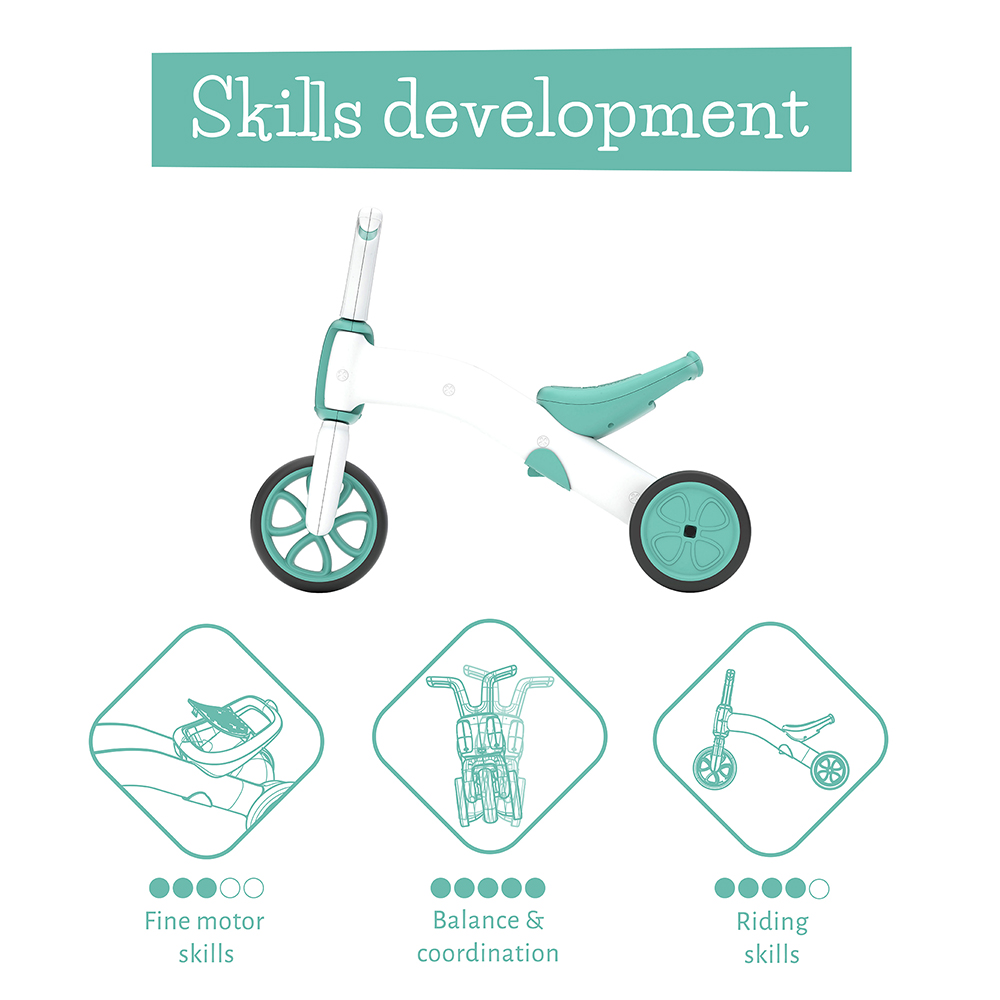 Zadnja dva točka u tricikl modu pružaju stabilnost, ali su postavljena bliže jedno drugom, tako da dete oseti kontrolu nad sopstvenim balansom i samopouzdanje pri vožnji.