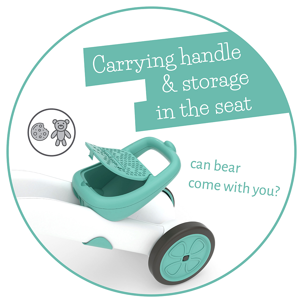 Bunzi je lagan (1,8 kg), što olakšava nošenje zahvaljujući praktičnoj ručki na sedištu. Skrivena korpica omogućava da dete ponese omiljenu igračku ili užinu, a pritom trenira finu motoriku dok upravlja svojim vozilom.