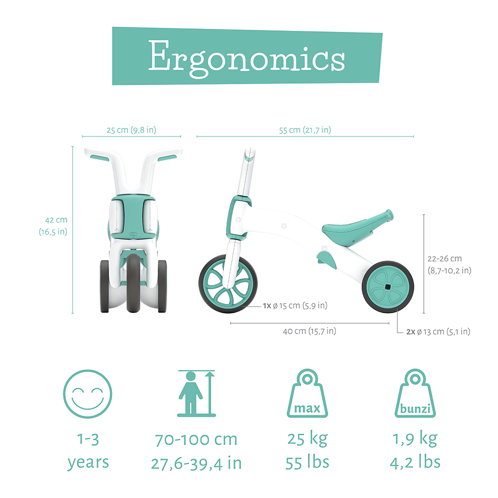 Sa rukohvatima u obliku zečića, intuitivnim dizajnom koji raste sa detetom i živopisnim bojama koje ističu ličnost vašeg mališana, Bunzi će postati omiljeni pratilac u igrama. Preporučeno za decu od 1 do 3 godine, maksimalna nosivost: 25 kg.