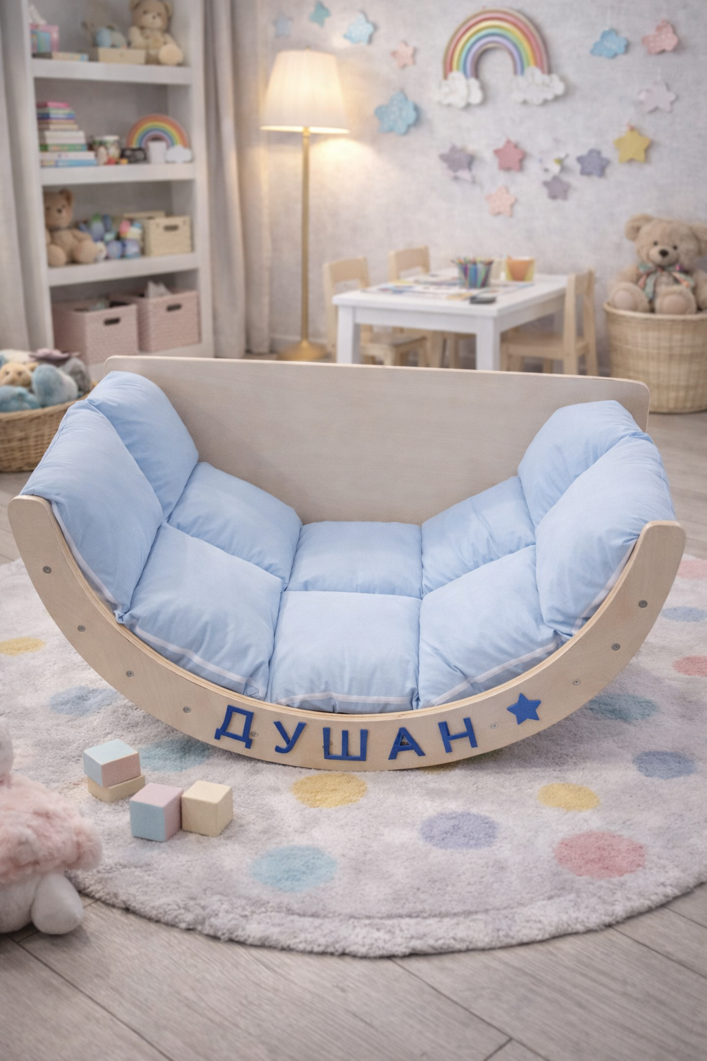 Elegantna nežno plava boja predstavlja idealan izbor za dečake i savršeno se uklapa u moderne dečije sobe. Osim što doprinosi lepšem izgledu prostora, jastuk pruža i dodatnu mekoću koja igru čini prijatnijom i sigurnijom.
