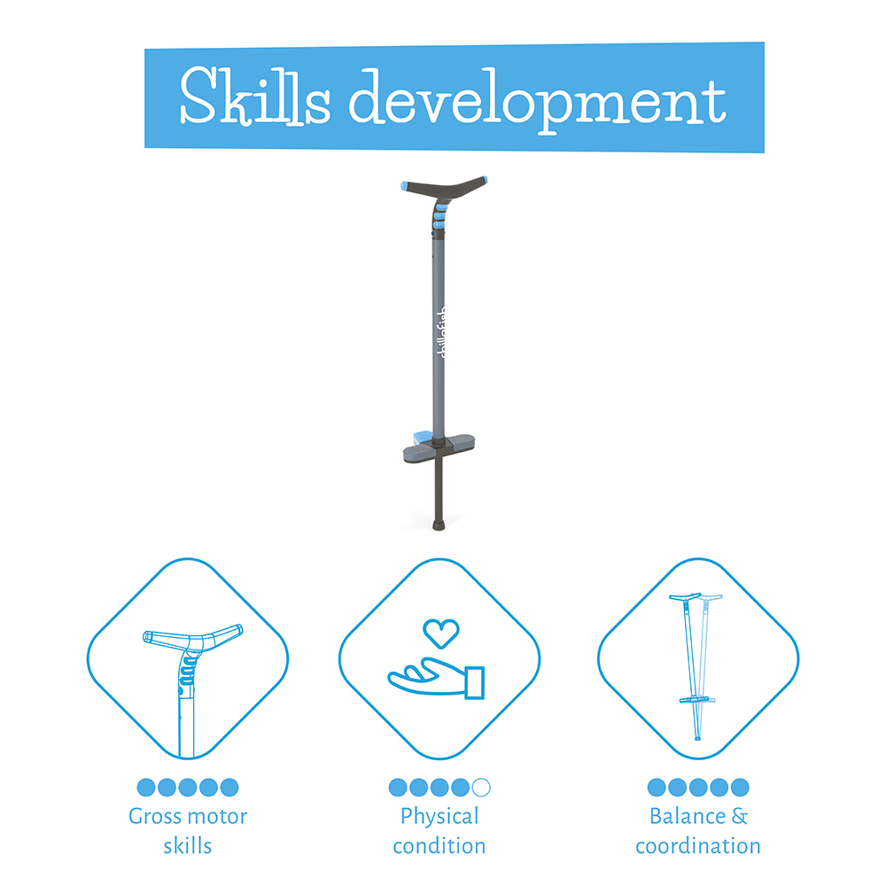 Zahvaljujući čvrstoj konstrukciji i snažnoj opruzi smeštenoj unutar cevi, pogo stik omogućava stabilno i dugotrajno skakanje. Mekana univerzalna ručka prilagođena je za držanje jednom ili sa obe ruke, pružajući bolju kontrolu tokom igre. Idealan je za razvoj grube motorike, ravnoteže i fizičke kondicije, a deca mogu da izazovu svoje prijatelje i pokušaju da skoče što više.